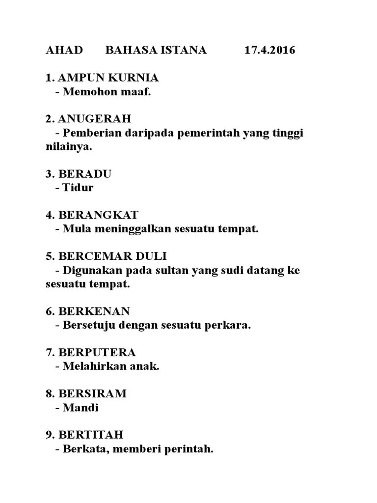 Apabila baginda tuanku bertitah, anda hendaklah menggantikan "tuanku" setiap kali bersetuju menggantikan "ya". Koleksi contoh bahasa istana dan maksudnya. Maksud ayat bahasa istana dan contoh ayat bahasa istana turut disediakan. Lalu baginda berangkat ke istana. Baginda telah berkenan untuk merasmikan kempen masyarakat penyayang yang akan diadakan di kompleks budiman esok. Membina empat ayat menggunakan bahasa istana berdasarkan gambar yang. Image result for bahasa istana math key words malay language words. Semak senarai ayat dan contoh bahasa istana pt3 bahasa melayu bm seperti maksud dalam kamus yang digunakan dalam soalan bahasa melayu pt3 .